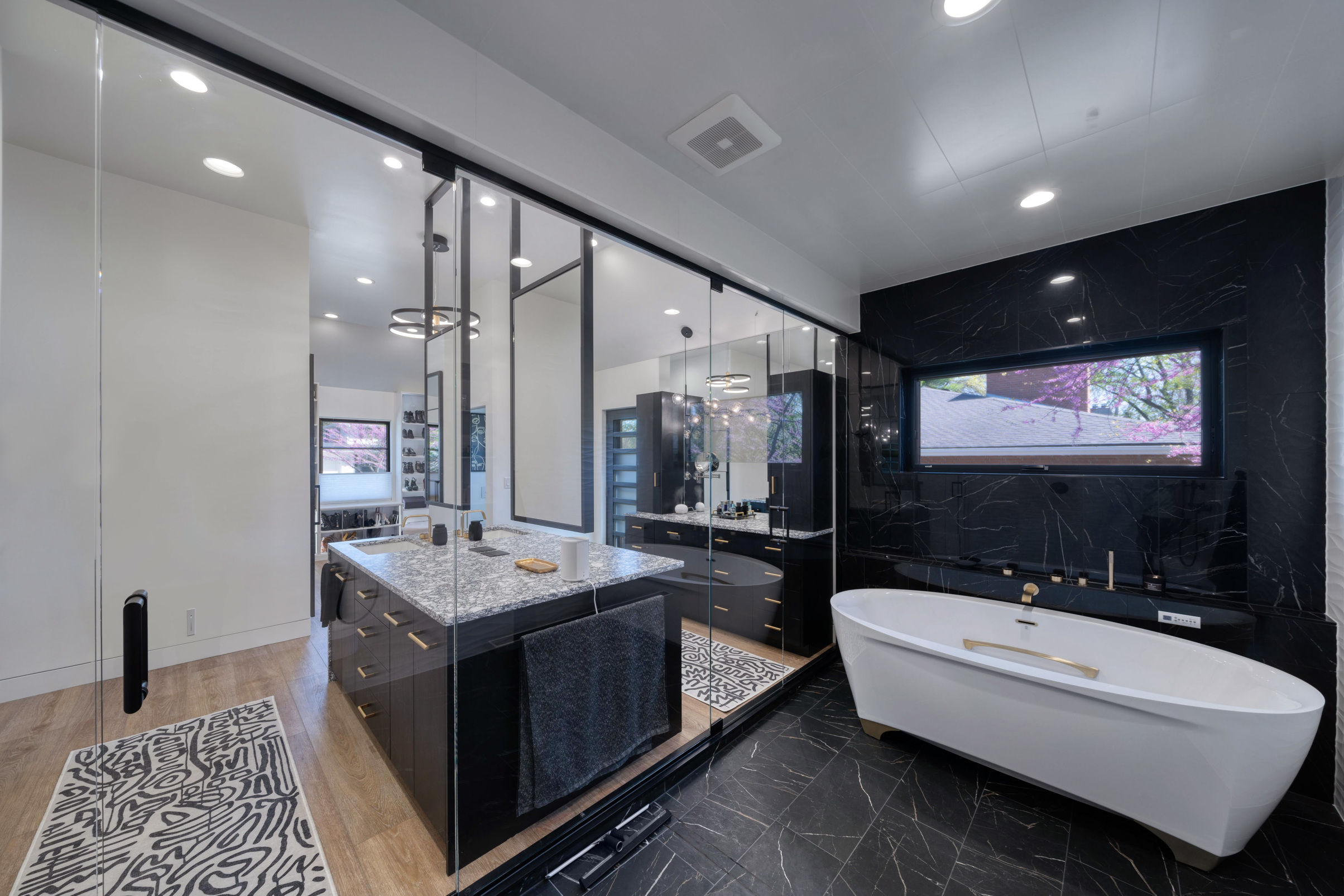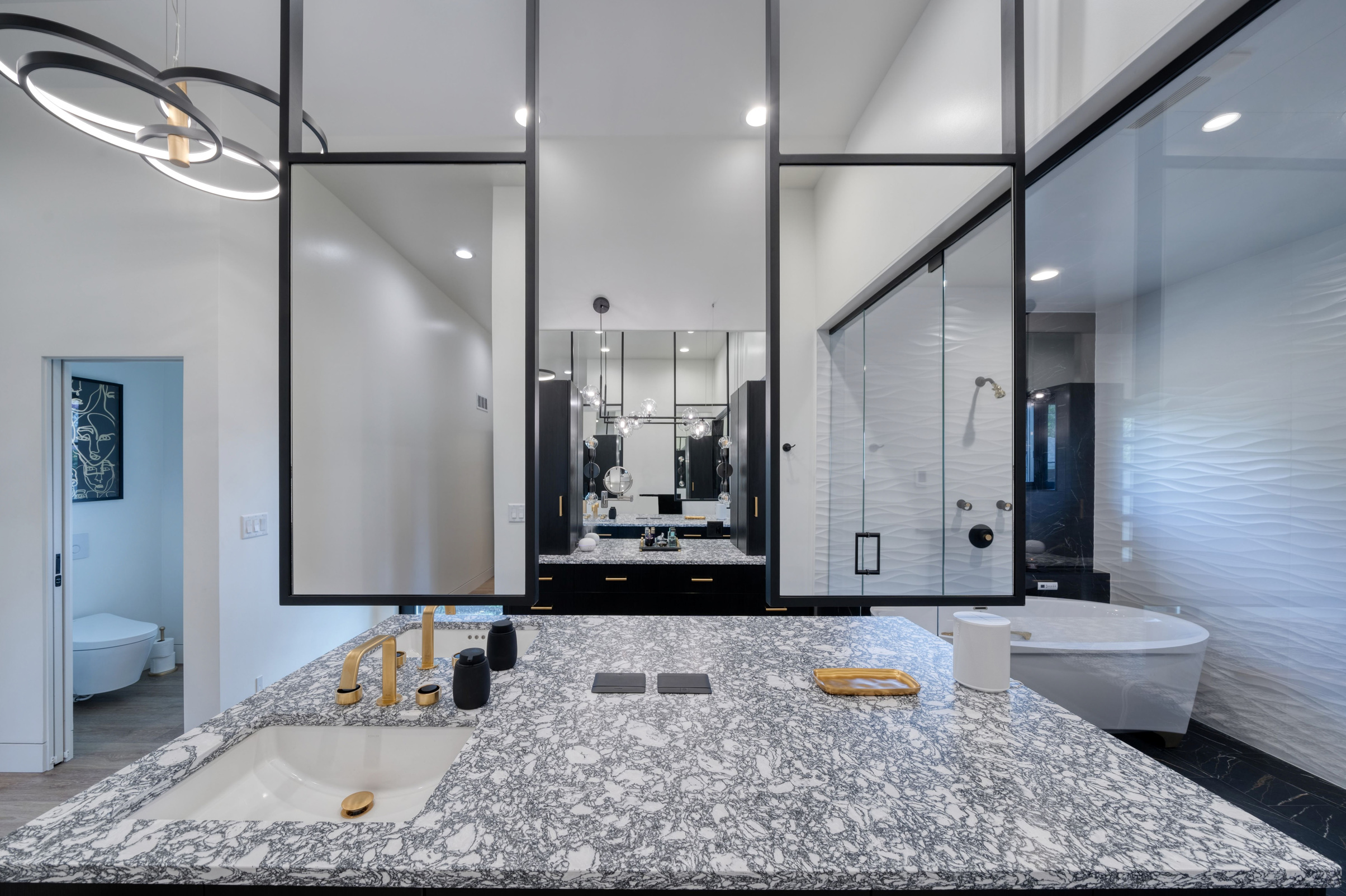 The generous bathroom has custom back-to-back vanities with Cambria Rose Bay countertop with waterfall edge and custom ceiling-mounted mirrors. There is also a spacious wet room that contains a Bain Ultra freestanding air tub, his and her shower systems and dog sprayer. There are custom shampoo niches and a floating shower seat. The separate water closet contains a Toto toilet with an in-wall tank and bidet.